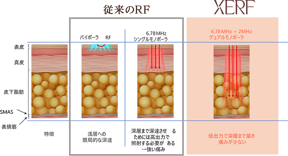 6.78MHzの周波数はたるみの改善にこれまで長く使われてきましたが、深い部分にまで効果を出そうとすると高出力にする必要があり強い痛みを伴うことがデメリットでした。しかし、XERFはマルチ周波数で照射することで低出力でも深くまでしっかり加熱を行うことができるため痛みが少なく、そしてより高い効果を出せるようになりました。