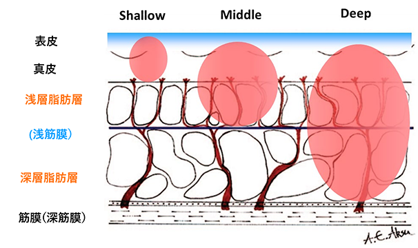 Deepモード:6.78MHzと2MHzを同時に照射。脂肪のたるみが部位にこれまでより深部を加熱することができます。
