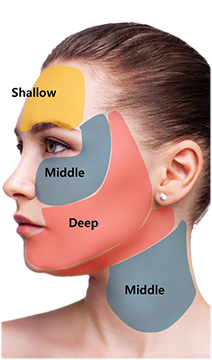 Sharrowモード:皮膚の真皮を中心に加熱することができます。浅い部位や脂肪が少ない部位のたるみ、また肌質改善を目的とした治療の際に使用します。